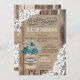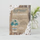 design de cartão de chá de panela, russo, com fôlego de bebê e buquê de hydrangea lacrimogêneo e marinho, no pote de Mason, com burlap e lace preso em fio azul marinho e renda branca sobre tábuas de madeira envelhecidas.