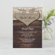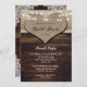 Convites de chá de panela de casamento russos apresentando um coração de braçadeira contra uma madeira rústica, burlap e fundo de renda adornados com luzes de cordas.