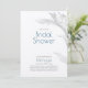 Um simples design rústico de chá de panela em papel Kraft. Um esboço de uma folha discretamente deslocada para a direita permite amplo espaço para suas informações. Nosso designer selecionou um azul-oceano rico para a noiva ser o nome e a palavra "chá de panela". Mínimo e feminino para um chá moderno. O inverso tem um padrão botânico desvanecido.