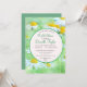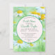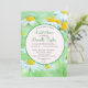 Margaridas brancas e amarelas sobre um fundo verde um círculo, em verde-menta profundo, para o seu chá de panela. "Chá de panela" e o nome da noiva estão na mesma matiz verde que o quadro e a parte traseira do cartão. Duas fontes contrastantes, um serif e um roteiro elegante, em uma combinação de capas superior e inferior, criam um convite espantoso.