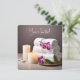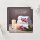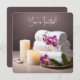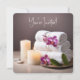 Orquídeas cor-de-rosa-claro com toalhas, pedras quentes e velas para chá de panela spa. Todo texto é editável.