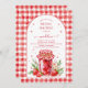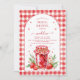 Celebrar a noiva com este charmoso chá de panela de compota de morango. Apresentando uma pintura aquosa de um boião de compota de morango num boião de safra com cobrir de frasco de gingham vermelho e branco, juntamente com delicadas flores de morango e morangos, o que é simplesmente adorável. Veja a coordenação de itens no nosso compro, Encantado Finch.