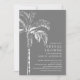 Chá de panela impressionante da palmeira, com um esboço branco de palmeira, sobre um fundo de cinza. Sacudir nosso chá de casamento convidar para ver uma palmeira coordenadora de volta para um toque especial extra. Visite o nosso compro para ver toda a nossa coleção de palmeiras.