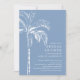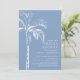 Chá de panela impressionante da palmeira com uma palmeira branca esboçada sobre um fundo azul. Sacudir nosso chá de casamento convidar para ver uma palmeira coordenadora de volta para um toque especial extra. Visite o nosso compro para ver toda a nossa coleção de palmeiras.
