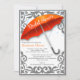 Este chá de panela elegante apresenta um grande guarda-chuva laranja com lindos cantos decorativos de rolagem e gotas de chuva. Fácil de atualizar com seus detalhes.