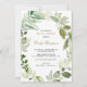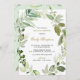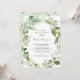 Convide familiares e amigos com este chá de panela de aquarela. Apresenta ilustrações de aquarelas de folhas e ramos de flores com um padrão de coroa verde correspondente para o dorso. Este convite verde é perfeito para primavera e chás de panela de verão. Personalize adicionando seus próprios detalhes.