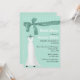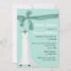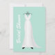 Chá de panela chic feito em verde-menta. Gráficos de uma camada verde de menta que parecem fita e arco decoram a parte superior, e um vestido branco de casamento decora o lado esquerdo dos convites. O texto branco e preto está pronto para personalizar o seu evento noivo. Excelente convite que a noiva amará.