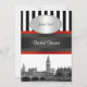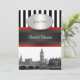 Skyline BW Black & White Stripe Invitation Red Ribbon Collection - Chá de panela Customizable Invtions and Aparelhagem com uma vista icônica do horizonte de Londres com uma foto de aparência gravada a preto e branco do Big Ben. Eles também apresentam um padrão de fundo listrado preto e branco e uma fita vermelha e preta, bem como uma etiqueta de gradiente branco com a escolha de uma moldura de cor prateada ou dourada. Remova o quadro que você não quer. Este produto faz parte de um conjunto de designs correspondentes que são facilmente personalizáveis para muitas ocasiões e eventos. Se você precisar de placas RSVP separadas, Notas de agradecimento, Carimbos, ímanes ou outros acessórios, por favor verifique nossas outras listas. Se você não vir um produto correspondente ao qual você está interessado, ou gostaria de ver esse design em cores diferentes, com elementos de outros designs, ou com fotos diferentes do NYCisMyMuse que você vê em nossa loja, entre em contato conosco e ficaremos felizes em personalizar um design para você! Observe que este é um design gráfico e não contém tecidos, metais, gemas ou relevo. 2013 ©NYCisMyMuse