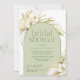 Convites de chá de panela tropicais em uma paleta de cores neutras atraente apresentam um elemento central arquivado com os detalhes do seu chá de panela, acentuado com frondes de palmeiras de cor verde-clara, folhagem de ilhas boho, orquídeas brancas, botânicos secos e gramíneas de pampas de praia.