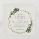 Os convites de chá virtual modernos com seus detalhes de evento dentro de um quadro geométrico dourado cercado por flores verdes e brancas. Este design botânico é excelente de chá de panela por correio para quando você não consegue se reunir pessoalmente. Quadro cortesia de:<a href="http://www.freepik.com">Concebida por Freepik</a>