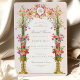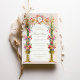Este maravilhoso cartão de salvamento de casamento apresenta uma luxuosa mistura de cores e detalhes florais intrincados inspirados no estilo Art Nouveau. A frente apresenta um arranjo floral exuberante de flores cor-de-rosa, vermelha e lavanda em vasos ouros elegantes, acentuado por caules verdes vibrantes. No topo, delicado filigre de ouro, enfeitado com motivos botânicos e toques de azul, rosa e ouro, rodeia as iniciais do casal. O fundo pastel macio melhora os ricos detalhes das flores e dá um toque refinado e sofisticado. O verso apresenta um intrincado padrão geométrico dourado, acrescentando um eterno e um toque elegante ao design do cartão. Perfeito para casais que querem anunciar sua data de casamento com um toque de charme clássico, misturando elegância moderna com a beleza da natureza.