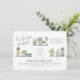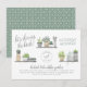 Todos nós temos uma senhora especial em nossas vidas que adora iluminar um quarto com suas lindamente cuidadas plantas. Este convite é para ela! Este design apresenta "chá da noiva!" em uma caligrafia elegante no canto superior esquerdo. Há três ilustrações da prateleira de uma casa separando o roteiro do nome da noiva e da data em um layout ziguezague. Abaixo, há o local do evento, endereço, informações de contato RSVP e registro. Cartões invertidos a um design de folha geométrica boho sobre fundo verde. Altere o texto clicando em "Personalizar este modelo". Há uma versão vertical deste design disponível em nossa loja, sinta-se à vontade para conferir!