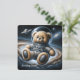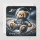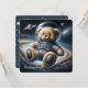 Um ursinho vestido com um traje astronauta está flutuando no espaço com um pano de fundo de galáxias e corpos celestes todo o texto é editável.