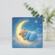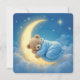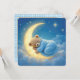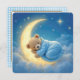 Um urso de pelúcia fofinho embrulhado num cobertor azul confortável repousa sobre uma lua crescente brilhante, cercado por nuvens lisas e estrelas cintilantes. Todo o texto pode ser alterado.