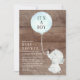 Adorável convite de chá de fraldas com o pequeno elefante mais bonito segurando um balão sobre um fundo de madeira rústica. Sacudir nosso convite para que possamos ver um fundo de coordenação para um toque especial extra. Visite nosso compro para ver toda nossa coleção de elefantes doces.