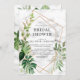Moderno, elegante e moderno, este design chá de panela apresenta uma geometria falsa de cobre embelezada com verde exótico de aquarela tropical em verde e ouro, sobre uma textura falsa de mármore branco. Personalizada na elegante tipografia suave e escura. A parte traseira da placa apresenta um buquê de folhagem botânica tropical em textura de mármore. Convidados Elegantes de Direitos Autorais. Todos os direitos reservados.