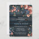 Ilustração de um buquê de peões de marinho azul e cobre embrulhado em cabo de corda e fio de cobre. As peônias têm um cesto de ouro nas pétalas. Há também flores pequenas da mesma cor das peônias do buquê. Marinho de planilhas de madeira azul para fundo.