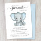 Um belo convite para o chá de um bebê com "A Sweet Little Peanut Is On Your Way" escrito em uma mistura de tipografia moderna de cinza mole e um roteiro de na moda, e uma aquarela azul pastel de um elefante bebê. Você pode personalizar o nome da mãe e os detalhes do chá em uma simples tipografia de cinzas.
