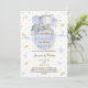 Convidado para Chá Dourado Elefante Bebê Azul Moluco de Mola Água. Elefante bonito e sonolento na lua, com detalhes reluzentes à volta, como estrelas e pontos de ouro, borboletas-reluzente, roteiro elegante e flores azuis-de-cor-d'água. Este convite é uma mistura de estilos boho, modernos e elegantes. Não se esqueça de descobrir a coleção de cheios.
