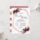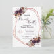 Este elegante chá de panela geométrico de brunch e rosa apresenta flores de cobre, púrpura, champanhe e mauve de ouro, um elemento geométrico de ouro rosa, com escrita tendenciosa com letra de mão e tiras de folha de ouro rosa. Fácil de personalizar com suas próprias informações de chá de panela. Isto é perfeito para o verão, primavera, outono ou casamento no inverno. A parte traseira apresenta tiras de folha de alumínio rosa de cobre.