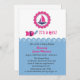 Um doce convite de chá para uma menina com um tema náutico. Design apresenta um veleiro cor-de-rosa em um círculo de borda escalpada, peixes cor-de-rosa com bolhas e borda de ondas azuis.