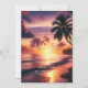 Uma cena de pôr do sol de uma praia impressionante com um céu ouro e roxo, ondas de oceano calmas, e uma silhueta negra de uma palmeira à direita. As matizes quentes refletem sobre a água, criando uma atmosfera romântica e serena — perfeita para um convite de casamento.