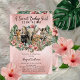 Uma colagem de doces animais da selva de safari selvagem — girafa, zebra, pântano, tigre e elefante — é acolhida acolhidamente entre o hibisco tropical e o verde da monstera neste design de Chá de fraldas "A Sweet Baby Girl Is On Way". Fundo é uma cor d'água rosa gradiente. O verso apresenta duas mudanças tropicais de canto sobre uma repetição do fundo da aquarela frontal. Design composto por Designs Holiday Hearts.