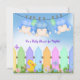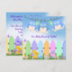 Triplets bebês pendurados na linha de roupas com cerca de piquete, pato, sapo e flores.