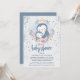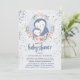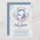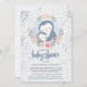 Convite de Chá de fraldas Virtual. Não consegue celebrar com uma mãe para ser ou com os pais para ser? Chá-os com amor e presentes para se prepararem para a chegada do seu bebê. O convite tem a mãe e o bebê pinguins em um fundo azul e borrifadas com brilho falso. Personalize com detalhes da parte, detalhes do registro e endereço de correspondência.