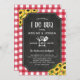 Gingham vermelho russo Eu faço o convite para o chá de casal com quadro reproduzido, girassóis amarelos, utensílios de grelhador cruzados e um anel de diamante armando a data do chá do seu quintal. Chalkboard e girassóis Eu CHURRASCO convite com uma borda vermelha de gingham e muitos girassóis amarelos.