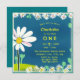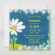 Um convite bonito, doce e na moda para a primeira (ou terceira, ou quinta...) festa de aniversário de uma menina. Ele apresenta um campo certeiro de margaridas doces e simples sobre um fundo azul e tipografia amarela e branca. Uma escolha encantadora para uma garotinha no seu aniversário de rua, segundo, 3º, 4º, 5 ou 6.