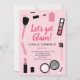 Vamos get glam é um convite de aniversário divertido para garotas interessadas em maquiagem e arrumação. Batom, pincel e esmalte em cor-de-rosa cinza serão um tema divertido para qualquer festa.