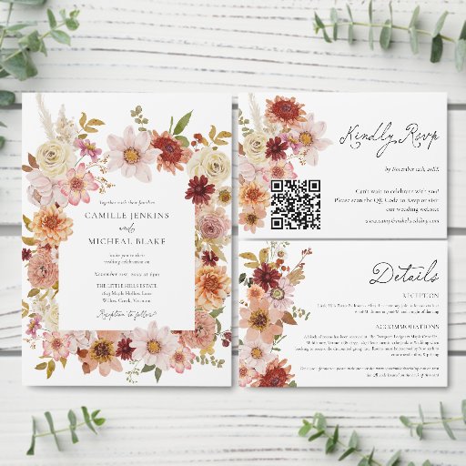 Defina o tom para o seu casamento outono rústico com este convite de código QR floral, perfeito para celebrações de outono aconchegantes. Apresentando tons sazonais quentes e uma charmosa vibração no interior, este convite é fácil de personalizar com seus detalhes de casamento. Adicione suas informações de evento e um conveniente código QR à parte traseira — ideal para vincular ao site do casamento, ao formulário RSVP ou ao registro. Certifique-se de procurar itens correspondentes na nossa coleção de cheios!