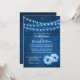 Tons azuis, estilo de fazenda do país de madeira rusticada, Convites apresentam fundo fotográfico de madeira com fio cintilante de luzes e margaridas de flores. Misturar e combinar este casamento... salvar a data com a nossa coleção de papelaria de casamento e favores.