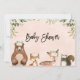 Animais de floresta doce e fêmea selvagens com um convite de chá de fraldas temático com quatro lindos animais de floresta, alguns arranjos florais cor-de-rosa e folhagem. Esta é uma forma doce de convidar convidados para o chá de fraldas de safari de uma menina.