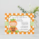 Adorável convite para o Chá de fraldas de outono moderno, com um bebê fofo vestindo uma fantasia de abóbora-doce colocada sobre um fundo polca-laranja pontilhado com uma banda verde-listrada branca. Itens correspondentes disponíveis em nosso compro. Perfeito para chá de fraldas de menino, chá de fraldas de menina ou chá de fraldas neutro em sexo. ©JD Digi Designs