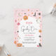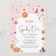 Ela é uma Festa de aniversário "Spooky One" - super fofinha, cor-de-rosa, 1rua Boo-day Convite com um design de Arca. Um convite para as vossas filhas na primeira festa de aniversário. Rosa, laranja, preto e branco com adoráveis jack-o-lanternas, fantasmas felizes com chapéus de festa, chapéu de bruxa, gato preto, abóboras rosa, morcegos, aranhas e milho doce. Personalize com seu nome de Crianças e detalhes da festa.