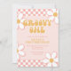 Groovy Girl Retro inspirou o convite para primeiros aniversarios com fontes do estilo 70 e margaridas e padrão de verificador.