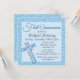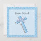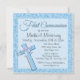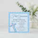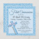 Primeiro convite de comunhão de sequência azul bonito. Apresenta uma bonito cruz espumante com arco de cetim contra um fundo estéril azul claro e branco. Ilustração desenhada à mão por McBooboo.