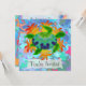 Cartões de convite de dois lados. O Front tem o personalizável "Você é Convidado". Voltar tem tem informações de convite — introduza o título do evento, a data, a hora, a localização e uma mensagem pessoal. Uma tartaruga verde pintada digitalmente com uma casca com padrões contra um fundo de algas laranja como as chamas.