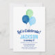 Um belo convite de aniversário para um menino. Este design apresenta balões de aquarela pintados manualmente em azul, marinho e verde.