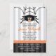 Estes convites para o chá de bebê de aranha laranja e negra são mais doces do que assustadores. Uma aranha-bebê com um pacificador laranja na boca cai de uma teia sobre uma cinza e um fundo listrado branco. Estes convites para chás de fraldas de halloween são perfeitos para a nova mãe esperar um bebê. Trabalho de arte © Chrissy H. Estúdios, LLC. Todos os direitos reservados.