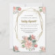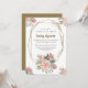 Bonito e delicado convite para chás de fraldas com rosas de aquarelas pintadas a mão, hidrangeas e peônias em tons de rosa, acentuadas com folhas de eucalipto. Seu texto está rodeado por uma moldura dourada com um confete como espargos (impresso plano - não um impressão de folha de papel) Personalize facilmente este convite elegante com os detalhes do seu chá de fraldas.