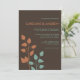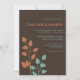 Esses convites de casamento simples, elegantes e modernos estão prontos para personalizar e apresentar dois ramos de folhas, ou ramos de folhas em laranja e chalé em fundo de chocolate. Estes convites para temas galho/folha são excelente para casamentos de outono ou outono.