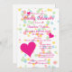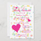 Os elegantes pontos de confete coloridos, convites para garotas. A festa personalizada convida com pequenos corações brancos. Design neutro adequado para o menino e para a menina. Personalizar forma de recorte. Cor de fundo personalizada. i.e. aqua, amarela, azul ou rosa. Linda tipografia de na moda com símbolos de amor antigos. Modelo personalizável com RSVP e linha do registro. Cartões bonitos para mulheres grávidas / mãe para serem. Pastel cor-de-rosa azul e verde.