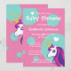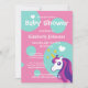Chamadas de chá de bebê de unicórnio para uma nova menina. Festa personalizada convida com pequenos corações e cavalo mágico. Design de modelo de vitrine com cor azul-rosa e azul-turquesa. Uma bela na moda tipografia com pequenos ícones de amor. Texto personalizável com RSVP e linha de registro. Cartões adoráveis para sua filha ou neta da princesa. Designs de papel clássico para mulheres grávidas ou para a mãe.