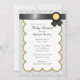 Bonitos convites com cinza de couro e cor damasco branca e design de fita preta com amarelo no topo.