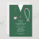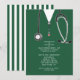 A festa de formatura de uma escola de medicina criativa convida a ter esfregões verdes em hospitais e estetoscópio. Editar texto para criar convite de festas médico exclusivo.