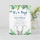Adorável chá de fraldas de elefante azul-marinho com design de folhas tropicais de cor aquosa e elefante para bebês.