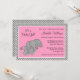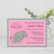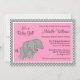 Um doce convite para chás de fraldas de elefantes, com uma ilustração de elefante branco sobre fundo cor-de-rosa com bolinhas de cinza. Perfeito para uma festa de chá de fraldas de menina! Gráficos © www.scrappindoodles.com